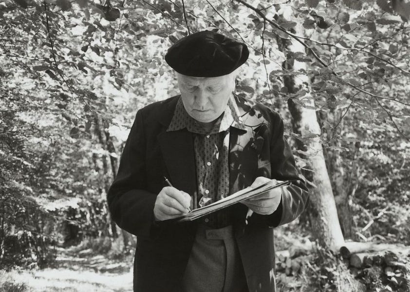 Messiaen, a sus 32 años, ya era un compositor singular. Amante de lo espiritual, sinfónico-organista de formación, y ornitólogo experto capaz de catalogar cientos de especies por su oído. Era un verdadero obsesionado de los cantos de pájaros: llevaba su cuaderno de pentagramas al campo para transcribir trinos. El Cuarteto para el fin del tiempo marca la primera vez que Messiaen incorpora abiertamente transcripciones de canto de aves en una obra. En el primer movimiento, “Liturgie de cristal”, el clarinete imita un mirlo y el violín un ruiseñor, dialogando en cascadas de trinos. En el tercero, “Abîme des oiseaux” (Abismo de los pájaros), el clarinete solo representa al pájaro cantando en el vacío del tiempo, como antítesis de este. Esta atención casi microscópica a los sonidos de la naturaleza conecta las transcripciones de Messiaen con algo que décadas más tarde sería común: grabar el mundo y hacer música con ello. Piensa en la música concreta de Pierre Schaeffer pocos años después, basada en manipular grabaciones de sonidos cotidianos, o en cualquier sampler moderno que introduce canto de aves, olas del mar o ruidos urbanos en una canción. Messiaen anticipó esa idea al decir: ¿por qué la música ha de limitarse a las escalas tradicionales? Escuchemos el canto de un petirrojo, ahí también hay un motivo musical. Además, Messiaen desarrolló técnicas fascinantes: modos de transposición limitada (escalas inventadas que no “resuelven” como las mayores o menores, dando un color armónico estático, brillante y extraño), ritmos no retrogradables (patrones rítmicos palíndromos, que suenan igual al derecho y al revés) e isorritmia (ciclos rítmicos y melódicos de distinta longitud superpuestos, creando efectos de bucle desfasado). Todo esto suena técnico, pero al oído se traduce en tiempo dilatado y en un color sonoro iridiscente. En el Cuarteto, Messiaen logra que el tiempo musical a veces parezca congelado (como en la Louange final, con ese cello que canta in extremis sobre acordes de piano como campanas distantes) y otras veces totalmente dislocado (como en la danza rítmica, con pulsos que se aceleran y frenan según secuencias numéricas secretas). Es literalmente música “fuera” del tiempo tal como lo conocemos.