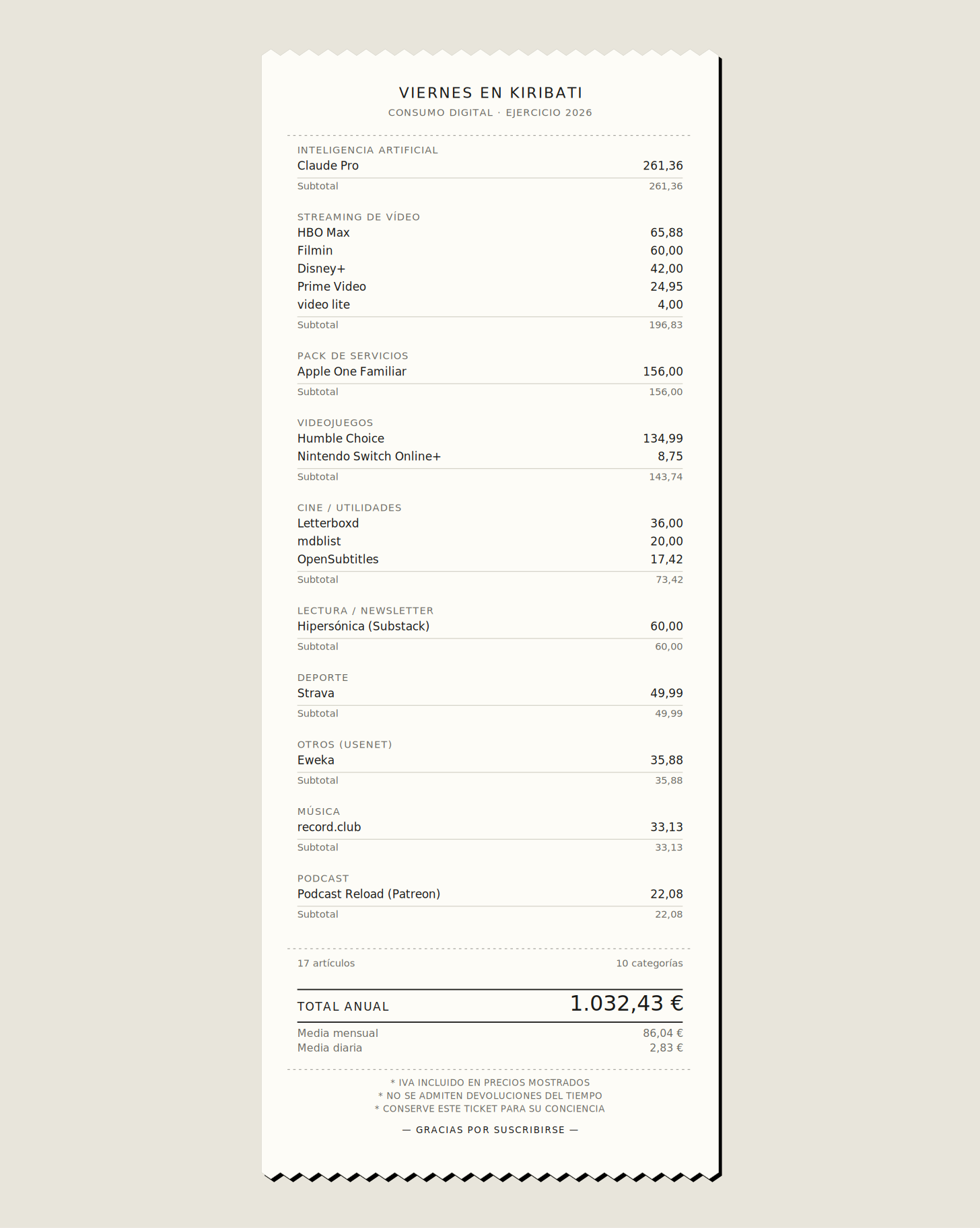 EDIT: Después de tener el texto escrito, me he dado cuenta de que también pago Bitwarden, un gestor de contraseñas. Unos 20 euros más al año. Pero no iba a rehacer el ticket con la chufladora de Claude solo para añadir esto.
