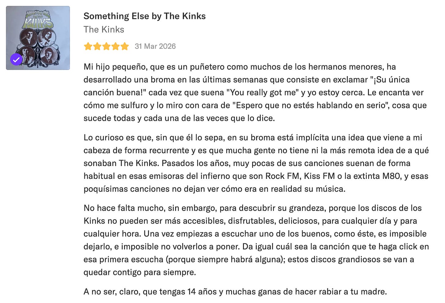 Así que cuando el hijo de Ana dice que “You Really Got Me” es la única canción buena de los Kinks, está haciendo exactamente lo que la biología, la psicología y la sociología predicen: está marcando territorio. Está diciendo “yo no soy tú”. Está ejerciendo su derecho generacional a construir una identidad propia a través del rechazo o desprecio parcial de la herencia musical de quien le crió. Y está haciéndolo seguramente, como buen hijo puñetero, con un guiño y una sonrisa, que es la forma más sana de hacerlo.